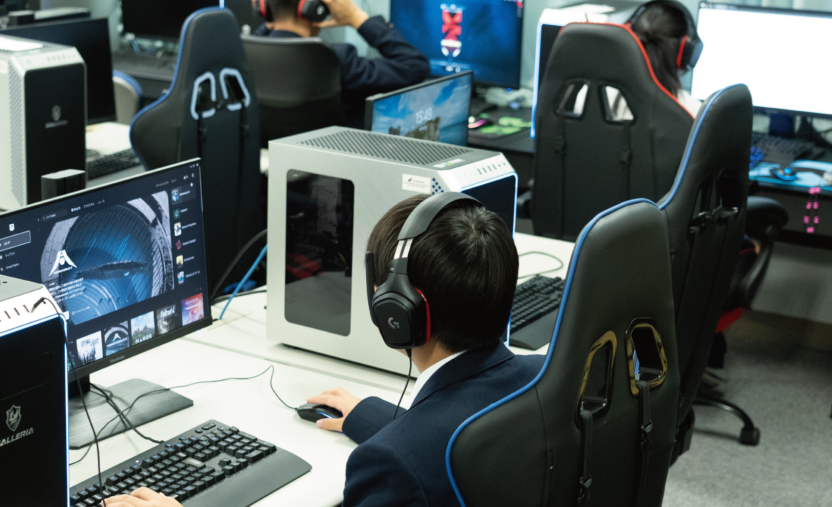 ハイスペックのゲーミングPCを15台完備し、日々切磋琢磨しています。もちろん自宅からのオンライン参加もできます。