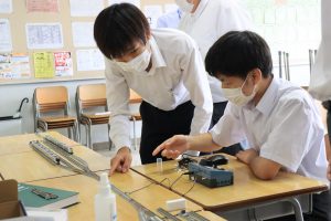 Nゲージ(実際に動く鉄道模型)を使用し、線路がどういう仕組みなのかなどを学びました。