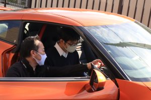 駐車機能について実際に運転席に座り勉強したりしました。
