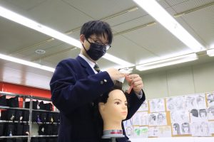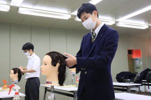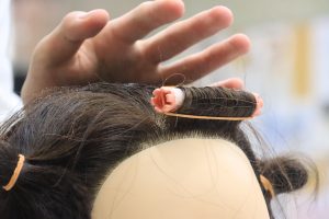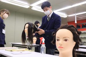 当日は、実際に美容師や、美容学生が使用するカットウィッグを使用し、三つ編みの巻き方や、ワインディングの練習や、授業見学を行いました。