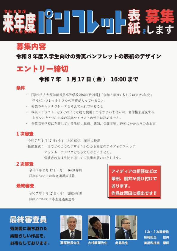 来年度に本校で使用する令和8年度入学生向けのパンフレットの表紙を秀英生向けに募集しています。