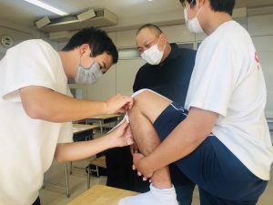 前回は、スポーツトレーナーになるために必須の上半身のテーピングの巻き方でしたが、2回目は下半身の巻き方も教わりました。